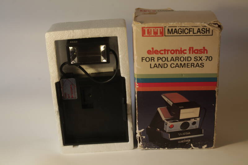 ITT magicflash. Laad snel op. Ziet er goed uit. Werkt overigens alleen op de eerste ( die zonder instelwig) en tweede ( die met instelwig) serie SX70. Dit ivm een krappere passing van de flitsaansluiting op de camera. Prijs 125 euro.